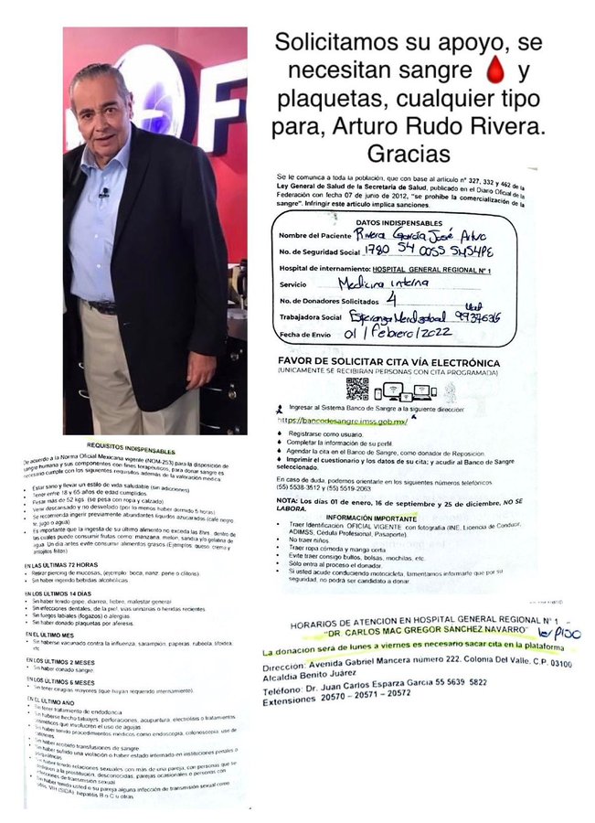 El exreportero y comentarista Arturo «Rudo» Rivera fue internado en el hospital debido a complicaciones en su salud y requiere donación de sangre este jueves 3 de febrero.