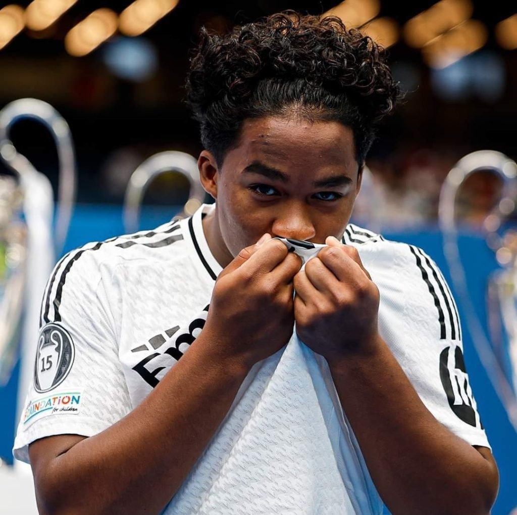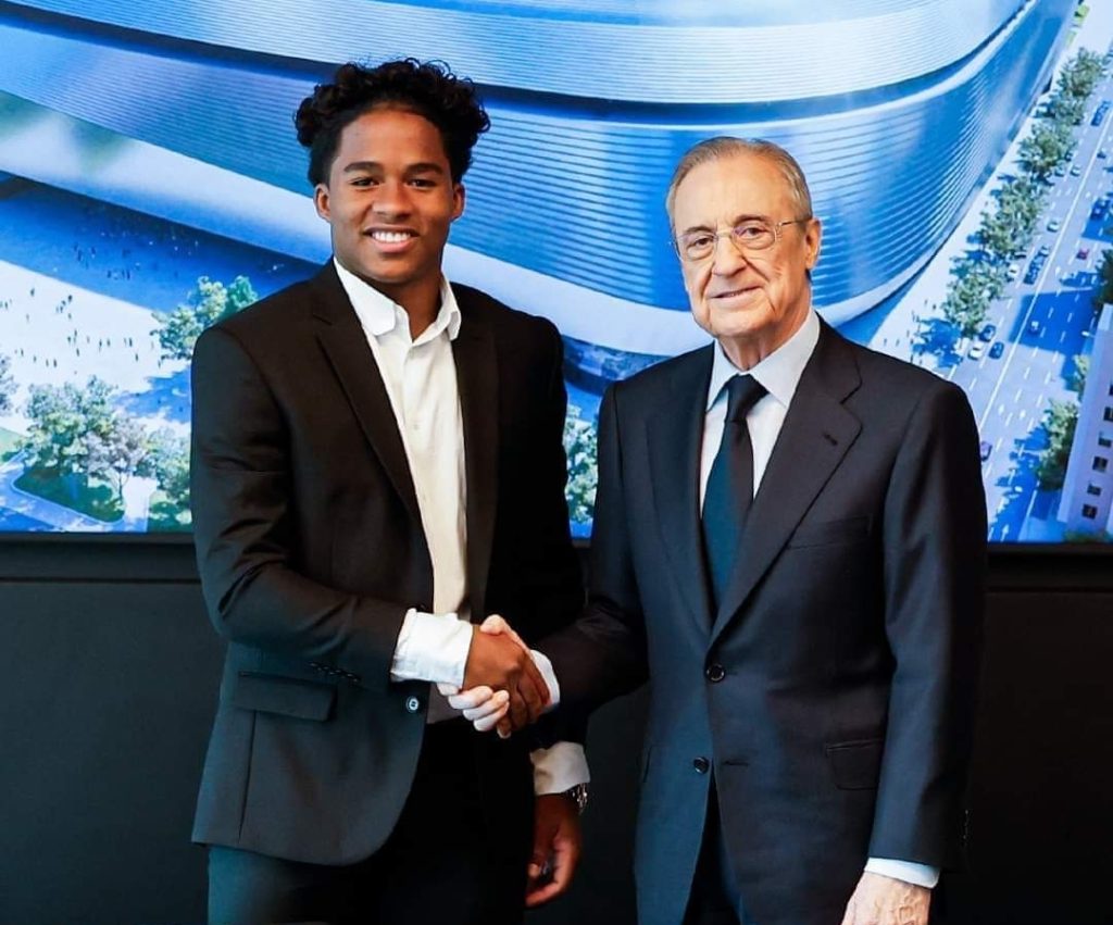El jugador brasileño Endrick Felipe, quien cuenta con 18 años fue presentado en el Estadio Santiago Bernabéu de manos del presidente del club Florentino Pérez.