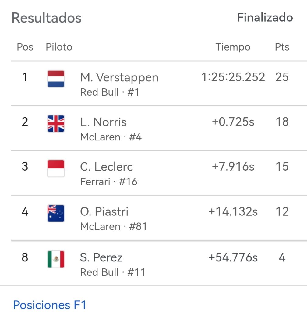 El segundo y tercer puesto los conquistaron Lando Norris De McLaren y Charles LeClerc de Ferrari.
