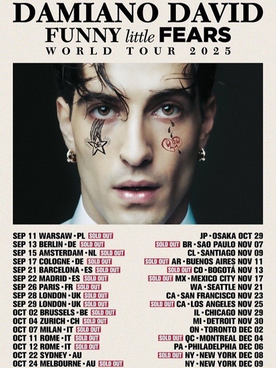 Muy pronto los fans de todo el mundo podrán escuchar en vivo las canciones de Funny little Fears, cuando Damiano David dé inicio este 11 de septiembre a su gira mundial 2025 – ella incluye fechas en Australia, Norteamérica, Sudamérica, Asia y una serie de presentaciones completamente sold out en Europa.