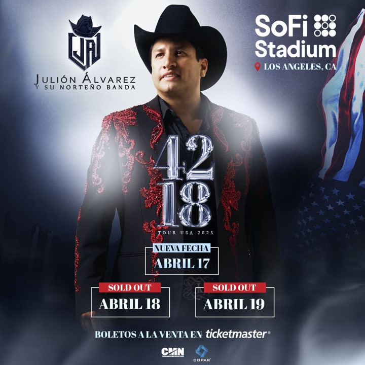 El cantante mexicano Julión Álvarez se convertirá en el primer artista latino en llenar tres veces consecutivas el SoFi Stadium de Los Ángeles, con casi 100 mil boletos vendidos en 48 horas y 140 mil personas en línea esperando para comprar.
