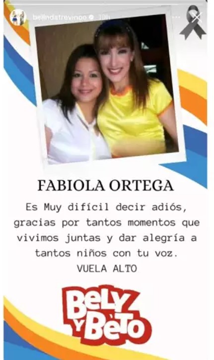 Su compañera de «Bely y Beto», Belinda Treviño, tomó sus redes sociales para colocar un mensaje. Con mucho sentimiento se despidió de su amiga Fabiola, de quien aseguró que trajo varios buenos momentos y alegrías a muchos niños.