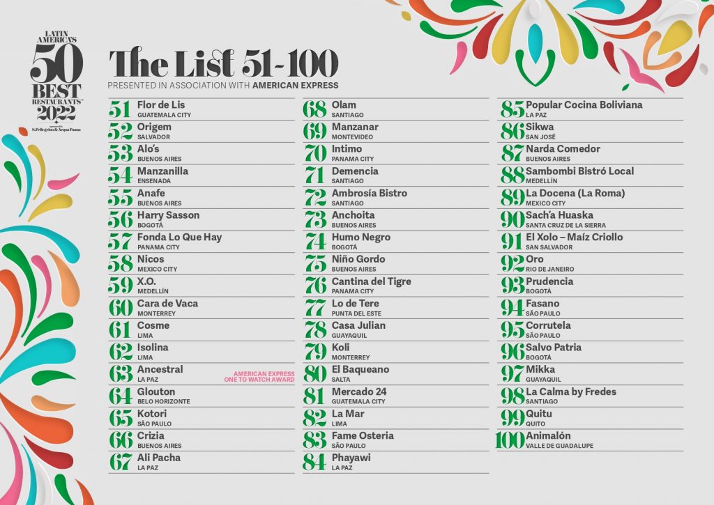 Latin America’s 50 Best Restaurants 2022, patrocinado por S.Pellegrino y Acqua Panna, reveló una parte de su prestigioso listado con la misión de reconocer a los mejores restaurantes de la región.