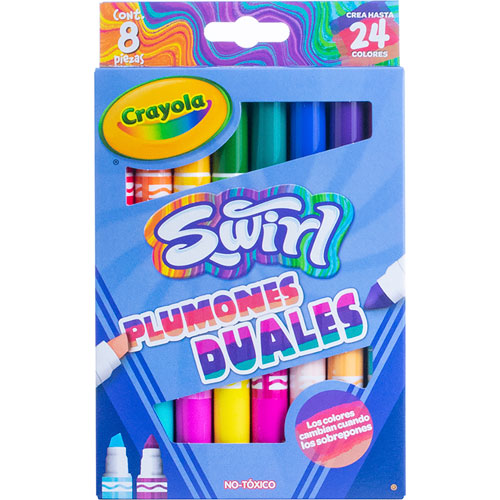 Los marcadores Swirl cuentan con una tecnología divertida para los niños pues, su doble punta permite superponer colores y crear nuevos tonos. Además, los lápices de colores son cremosos, resistentes y hechos con madera reforestada, para un dibujo cómodo y amigable.