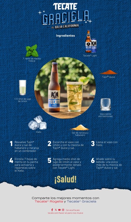 Ambas recetas pueden ser preparadas en casa, pero la buena noticia es que también habrá establecimientos en Cdmx, Guadalajara y Monterrey que servirán Tecate® Rogelia y Tecate® Graciela.